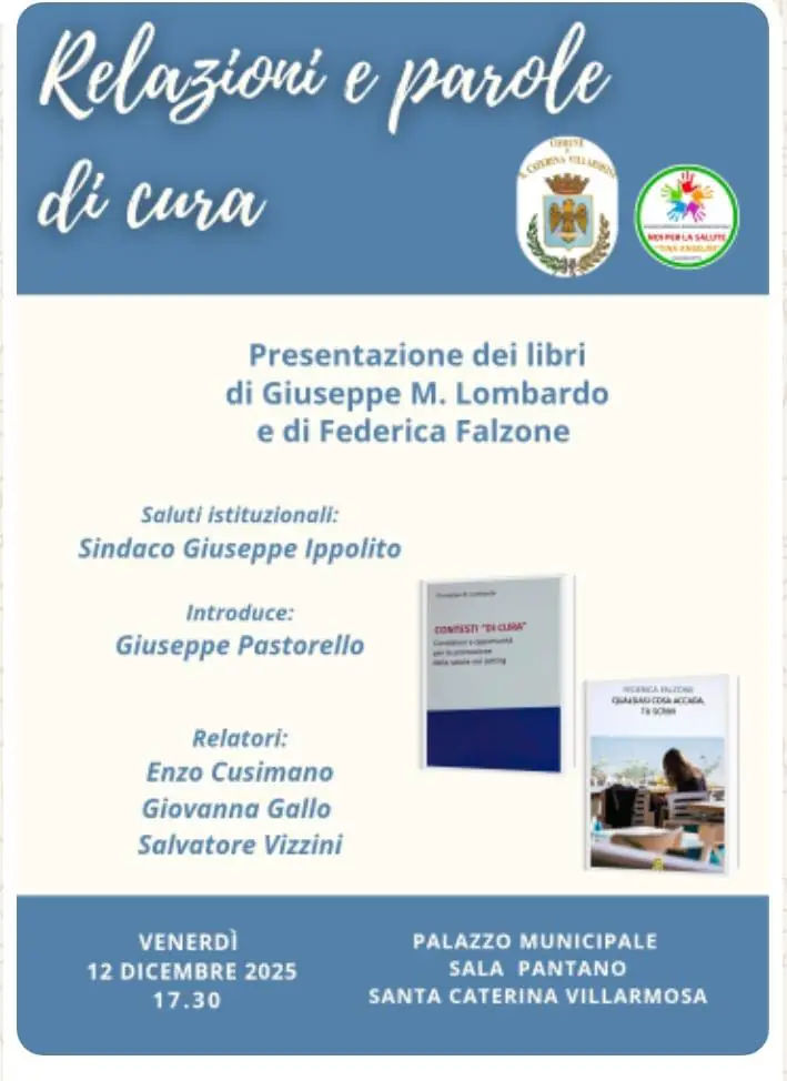 📚 Relazioni e parole di cura Domani un appuntamento speciale per la nostra comunità. Vi aspettiamo venerdì 12 dicembre alle ore 17:30, presso la Sala Pantano del Palazzo Municipale, per la presentazione dei libri di Giuseppe M. Lombardo e Federica Falzone. Un momento di riflessione e confronto sul v